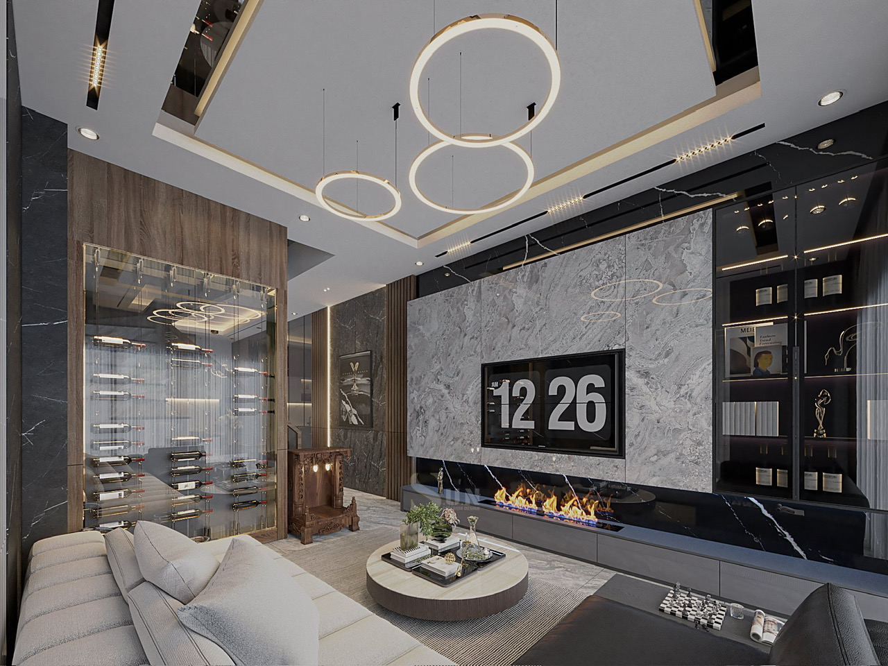 Hãy nhìn cách ánh sáng len lỏi trong các hộc tủ kính, tôn vinh những bộ sưu tập cá nhân của gia chủ.