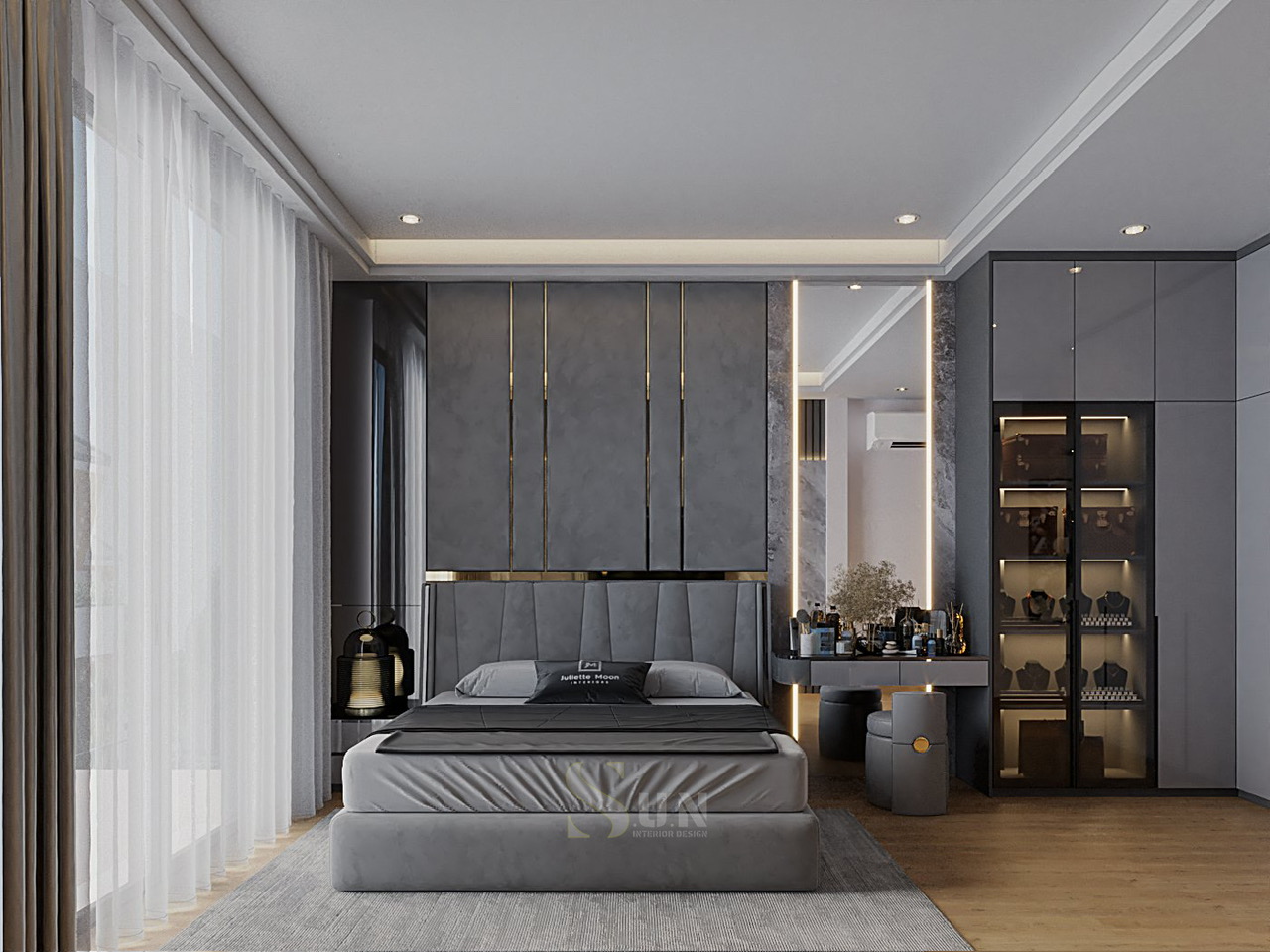 Hệ tủ kịch trần phẳng tuyệt đối, không tay nắm, như một bức tường kiến trúc hơn là một món đồ nội thất.