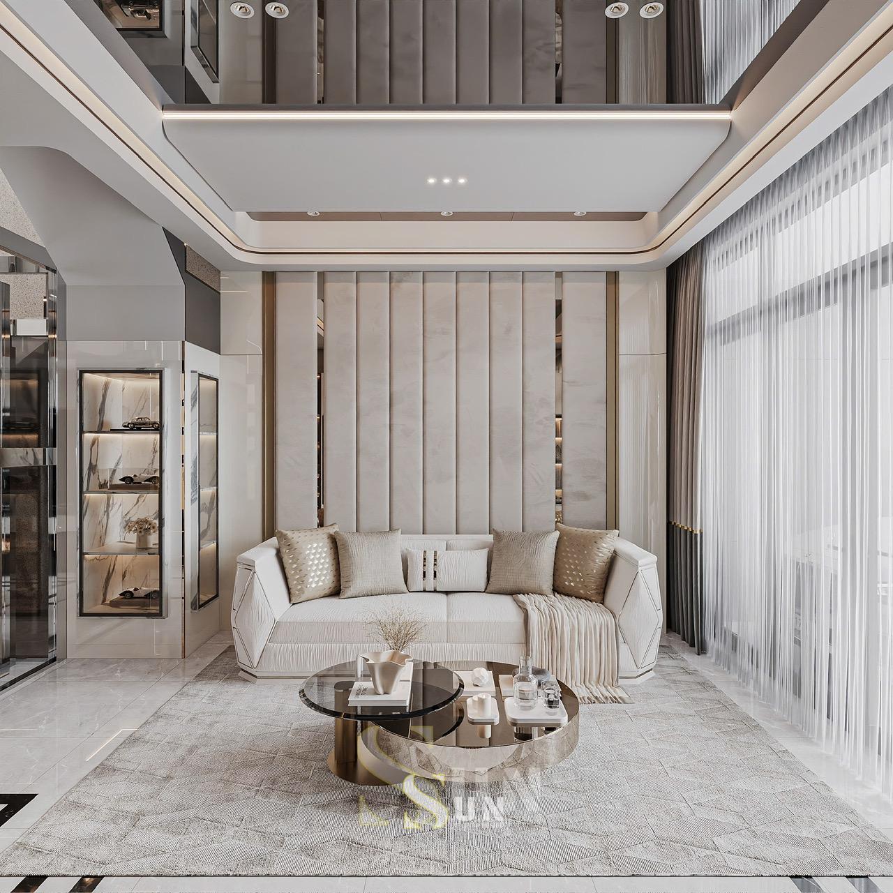 Nhìn vào không gian phòng khách, điểm nhấn ấn tượng nhất chính là hệ vách ốp trang trí phía sau sofa. Thay vì một bức tường phẳng đơn điệu, việc sử dụng các đường kẻ dọc (fluted panels) tạo nên hiệu ứng thị giác về chiều cao và sự thanh thoát.