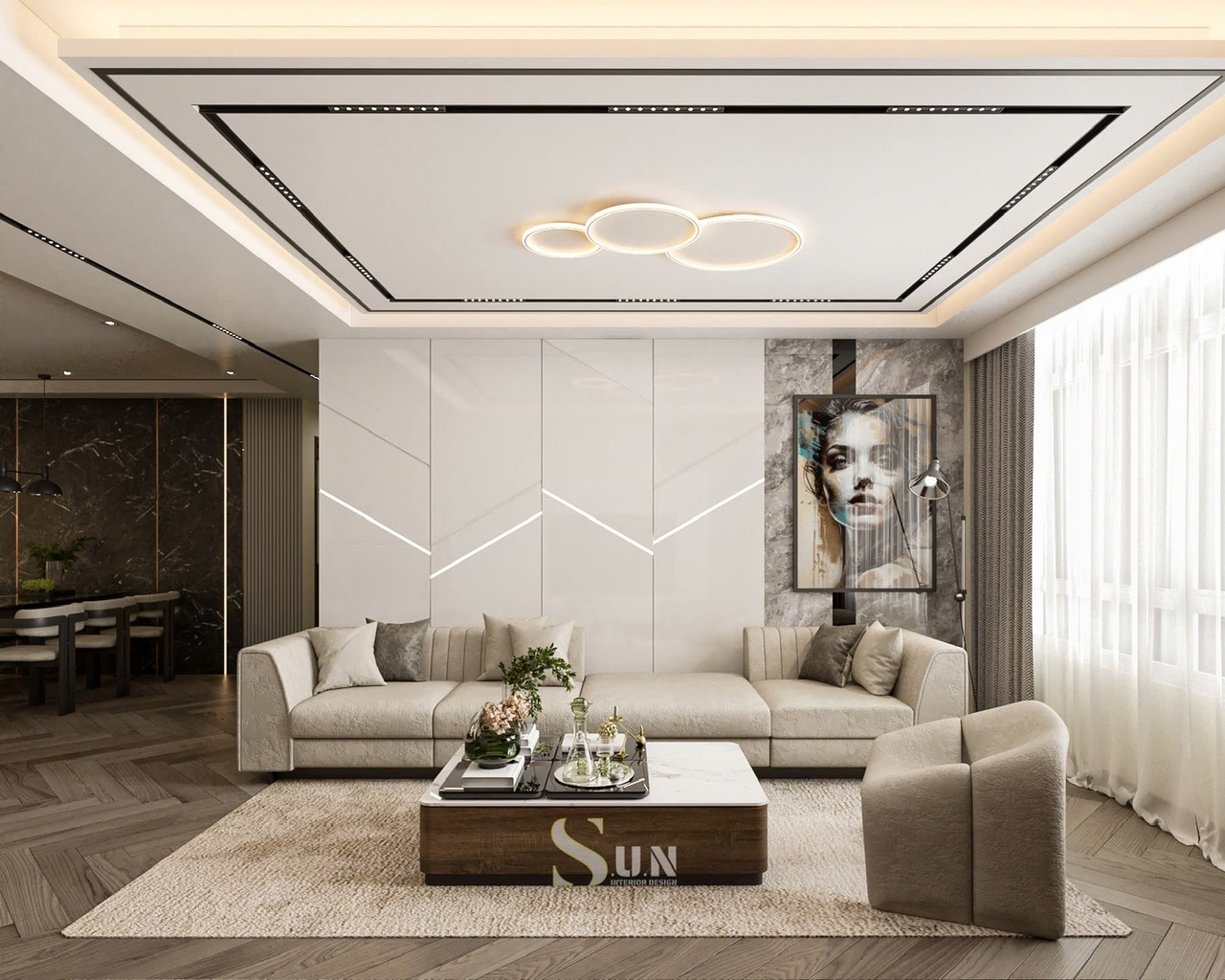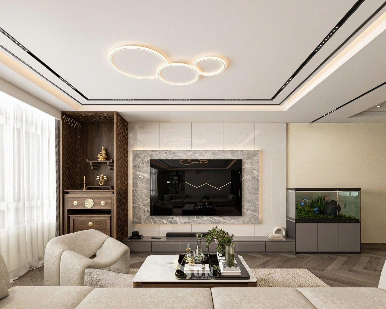 Giải pháp: Hệ tủ TV được thiết kế âm tường hoặc treo cao để lộ khoảng sàn, tạo cảm giác không gian được mở rộng theo chiều ngang. Các ngăn hở được bố trí ánh sáng điểm để tạo chiều sâu, biến bức tường tẻ nhạt thành điểm nhấn kiến trúc.