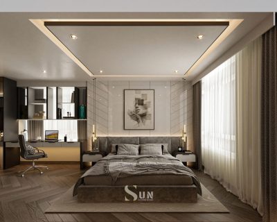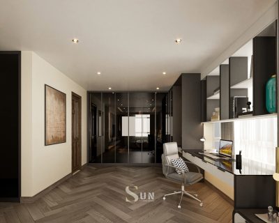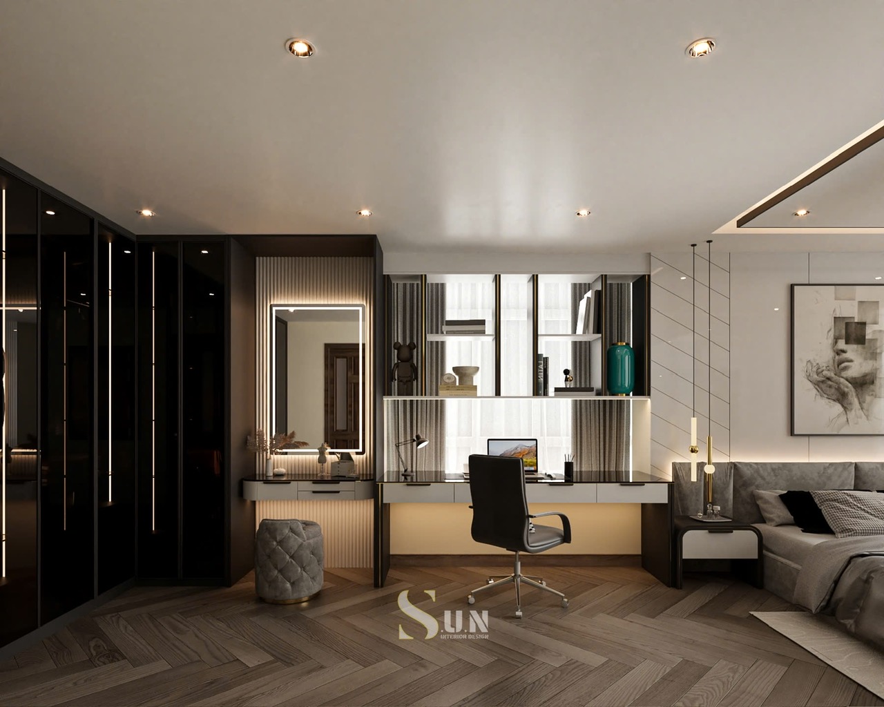Liên kết không gian: Bàn làm việc/bàn trang điểm được thiết kế nối liền với tủ áo, tạo thành một dải công năng chạy dọc theo tường, giúp lối đi trong phòng ngủ luôn thông thoáng.