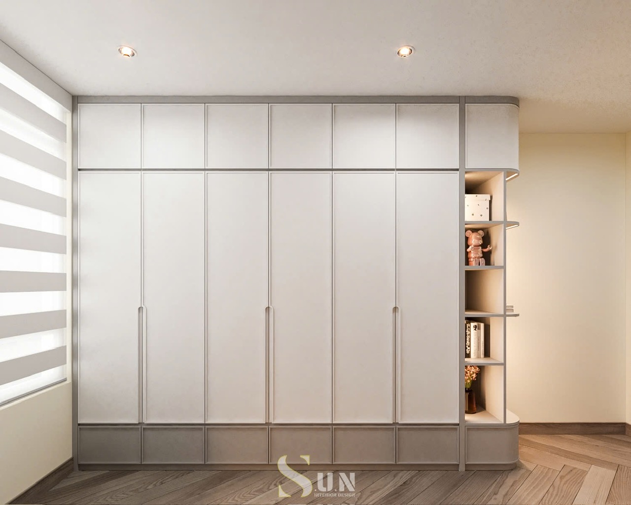 Tủ áo kịch trần: Cánh tủ phẳng hoàn toàn với màu sắc tiệp với màu tường giúp xóa nhòa ranh giới giữa nội thất và kiến trúc.